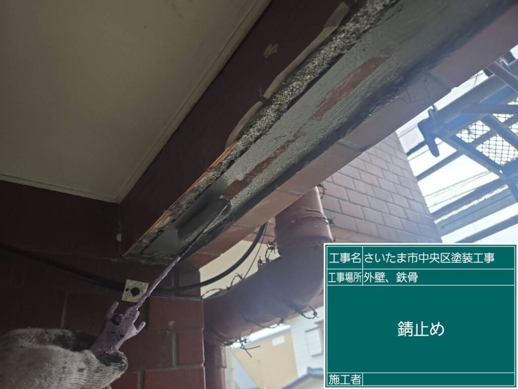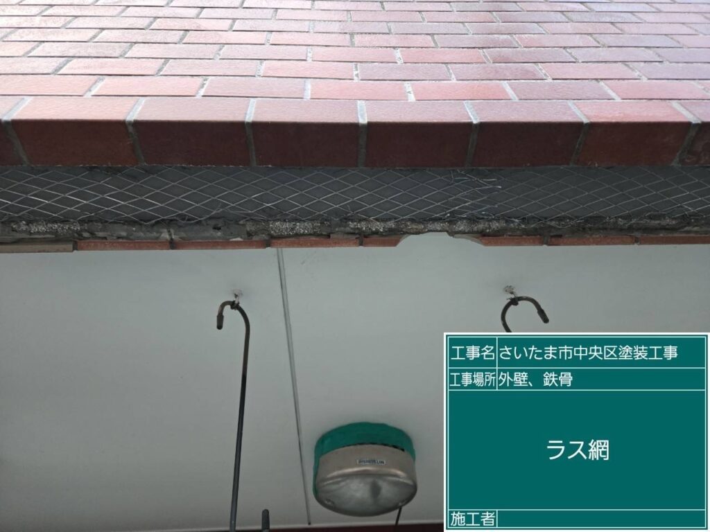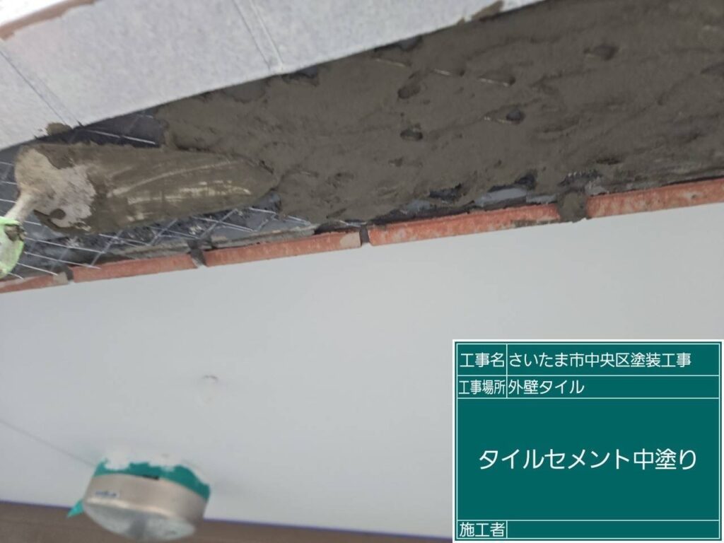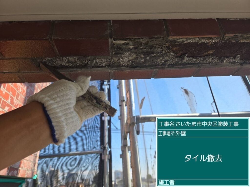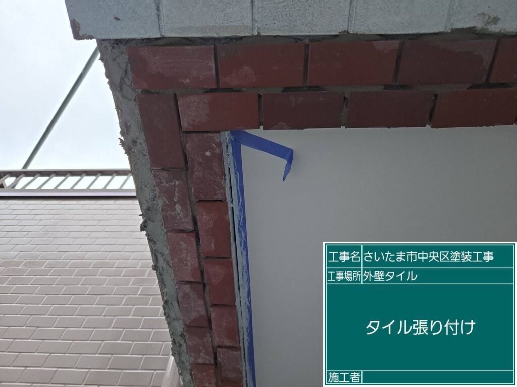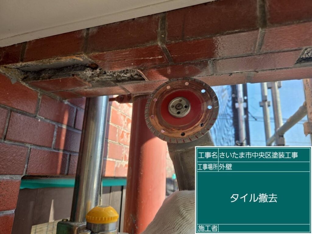 タイルの撤去をして錆止塗装を行い、ラス網施工してからタイルセメントを入れて新しいタイルに張り替えました。