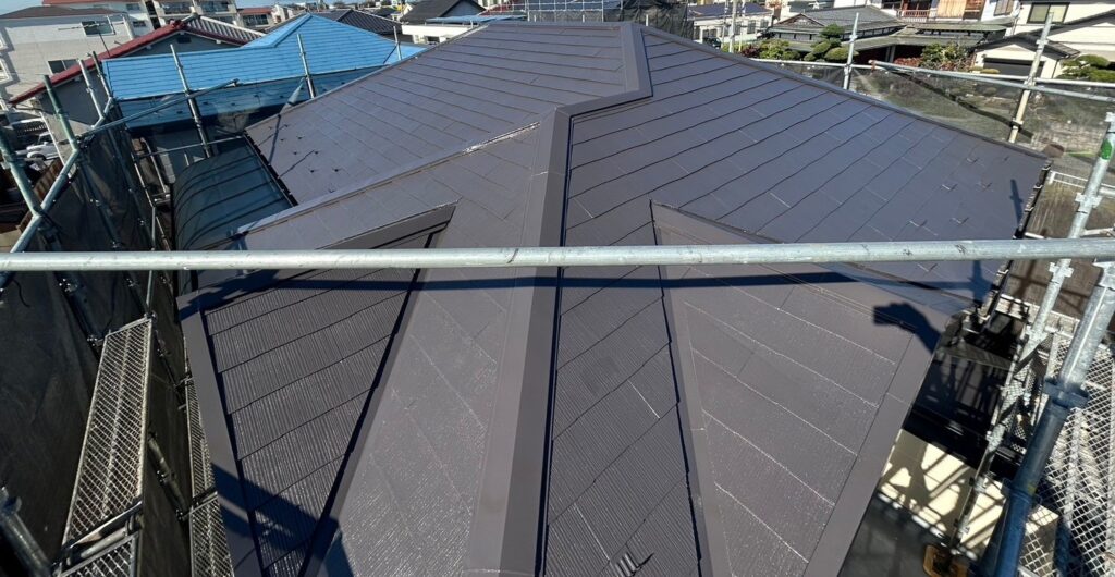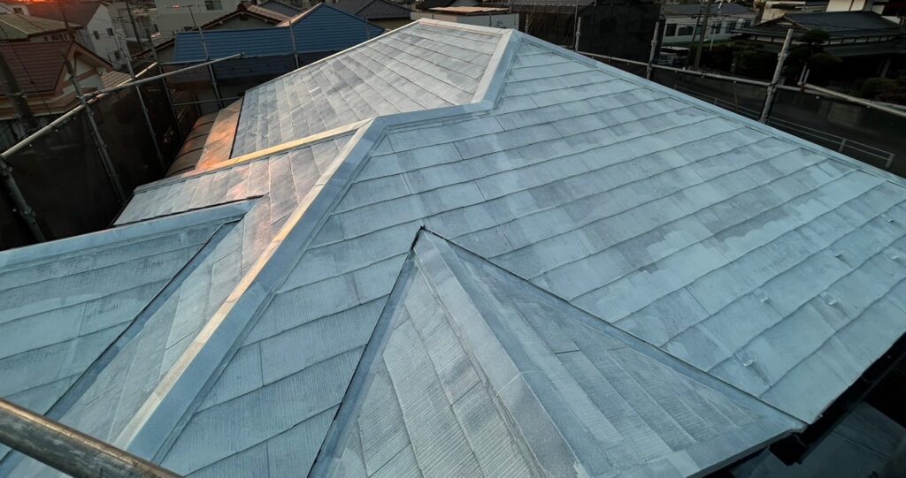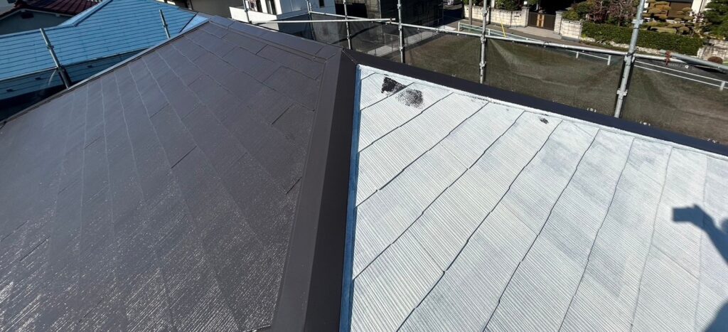 下塗り、中塗り、上塗りを行い屋根塗装は終了しました。