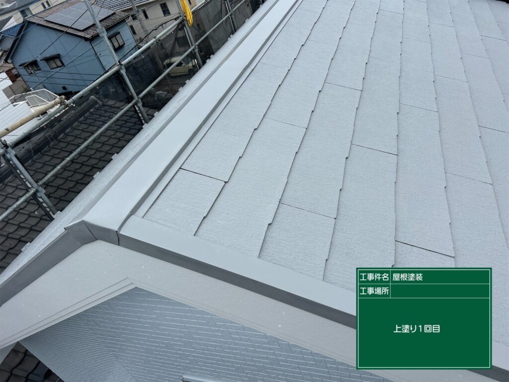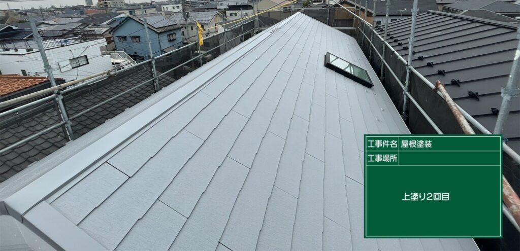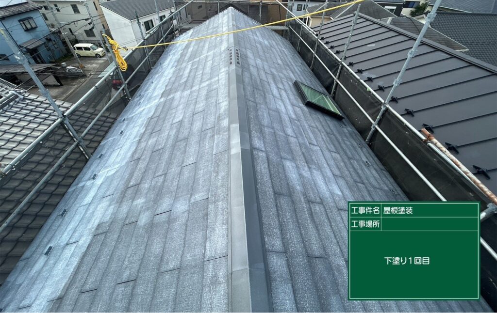 屋根の下塗り、中塗り、上塗りを行いました。
