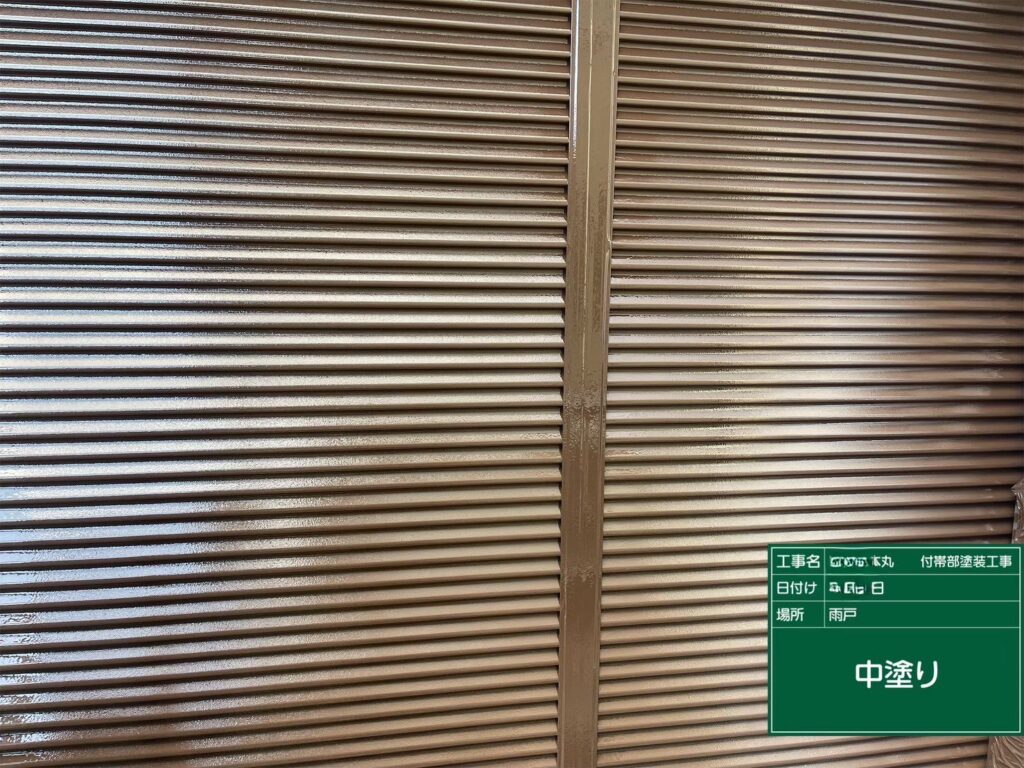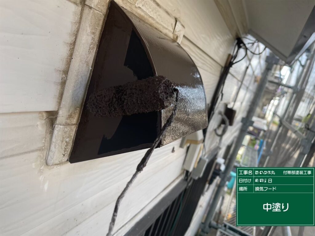 笠木、換気フード、霧よけ、雨戸の中塗りを行いました。